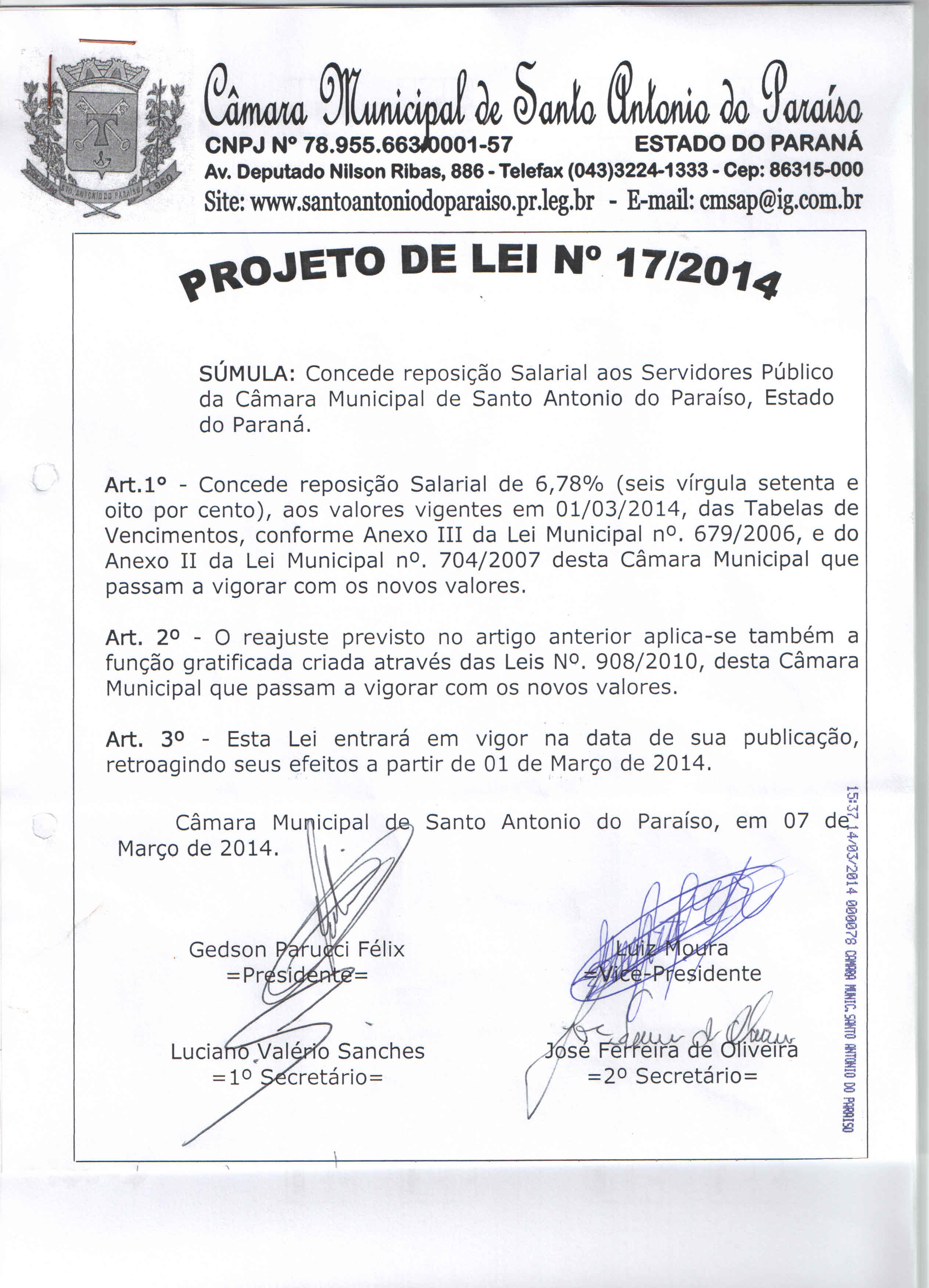 CONCEDE REPOSIÇÃO SALARIAL AOS SERVIDORES PÚBLICO DA CÂMARA MUNICIPAL DE SANTO ANTONIO DO PARAÍSO, ESTADO DO PARANÁ.